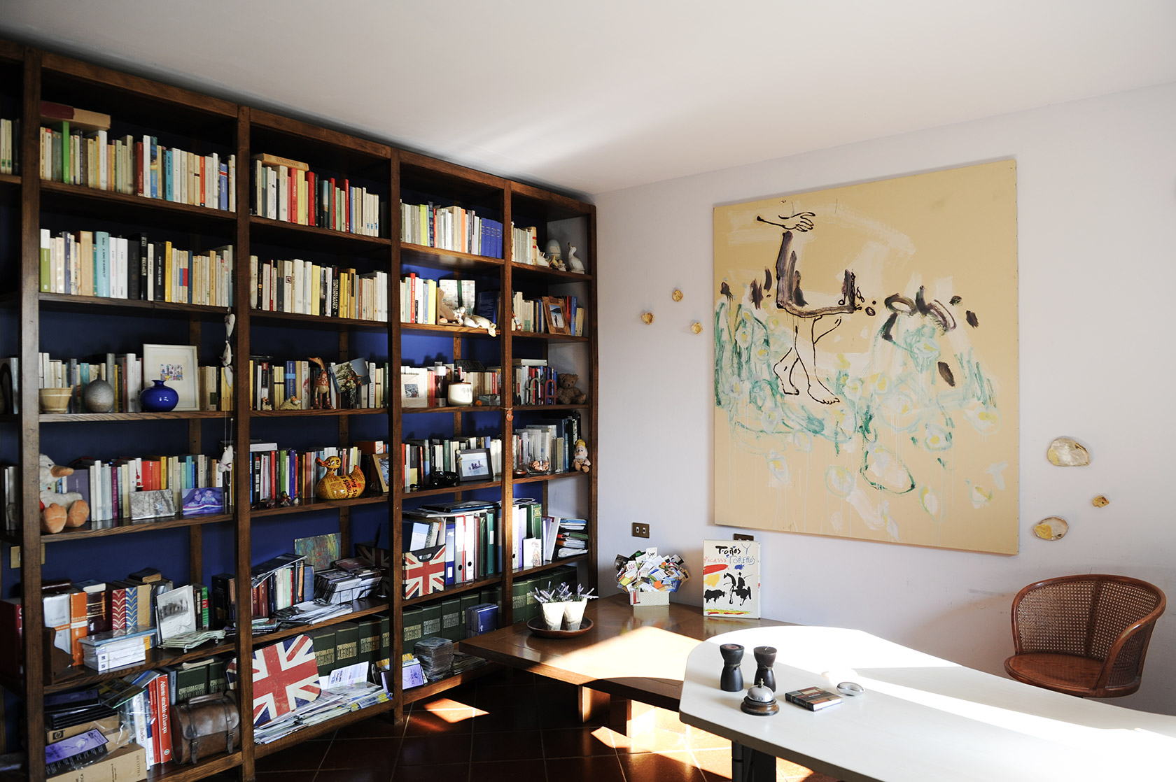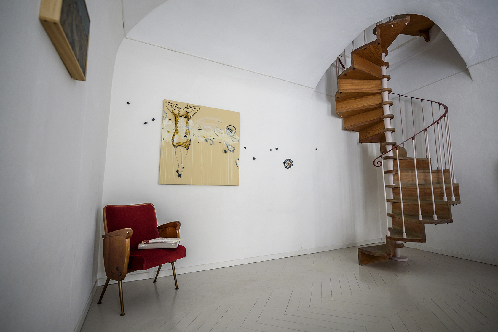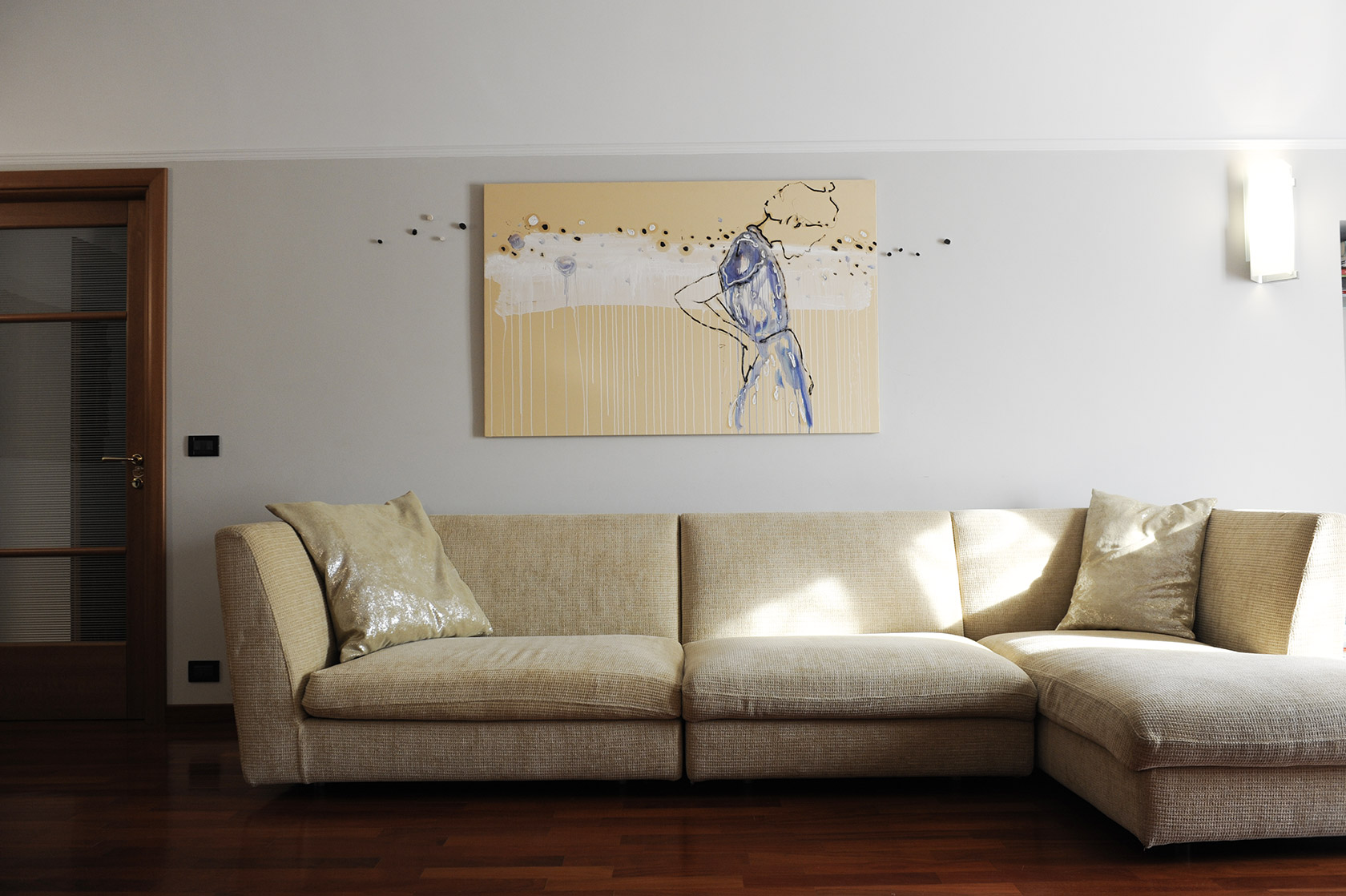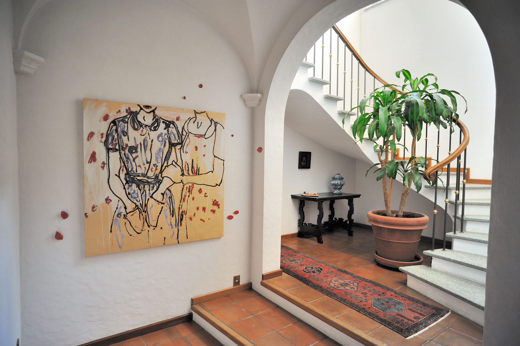 Diviene parte integrante dello spazio della casa, della sua architettura. Se l’opera esplodesse minando nello spazio parte di sé, allo spettatore è chiesto di ricomporla, in un colpo d’occhio.